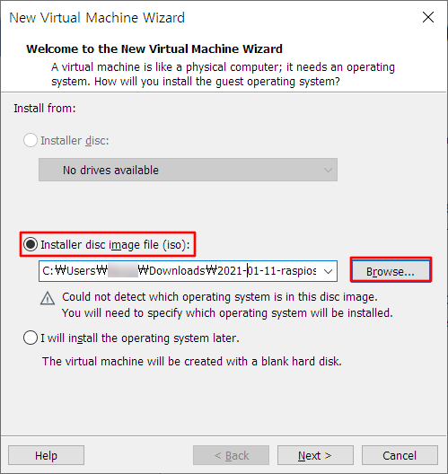 Installer disc image file을 클릭한 후에 Browse…를 클릭하여 설치할 OS의 iso파일을 지정해주자.