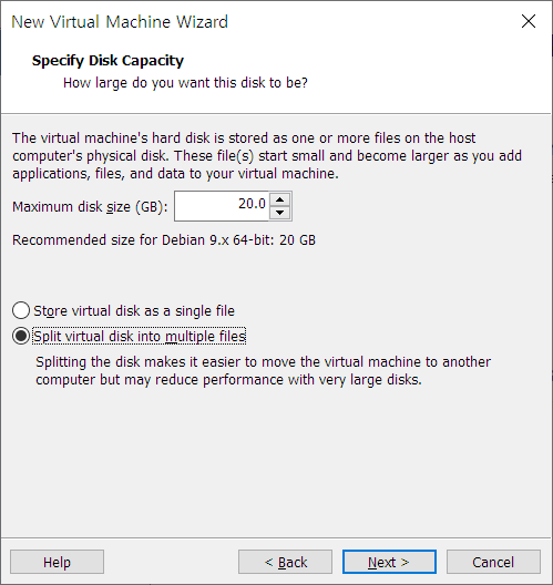최대 디스크 크기와 디스크 파일의 저장형태를 설정하는 화면이다.