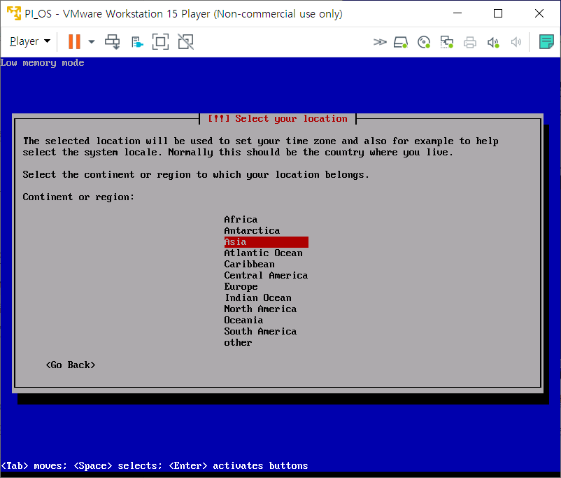다음은 계속하여 지역 설정이다. 본인의 거주 대륙을 방향키로 조작한 후 Enter
