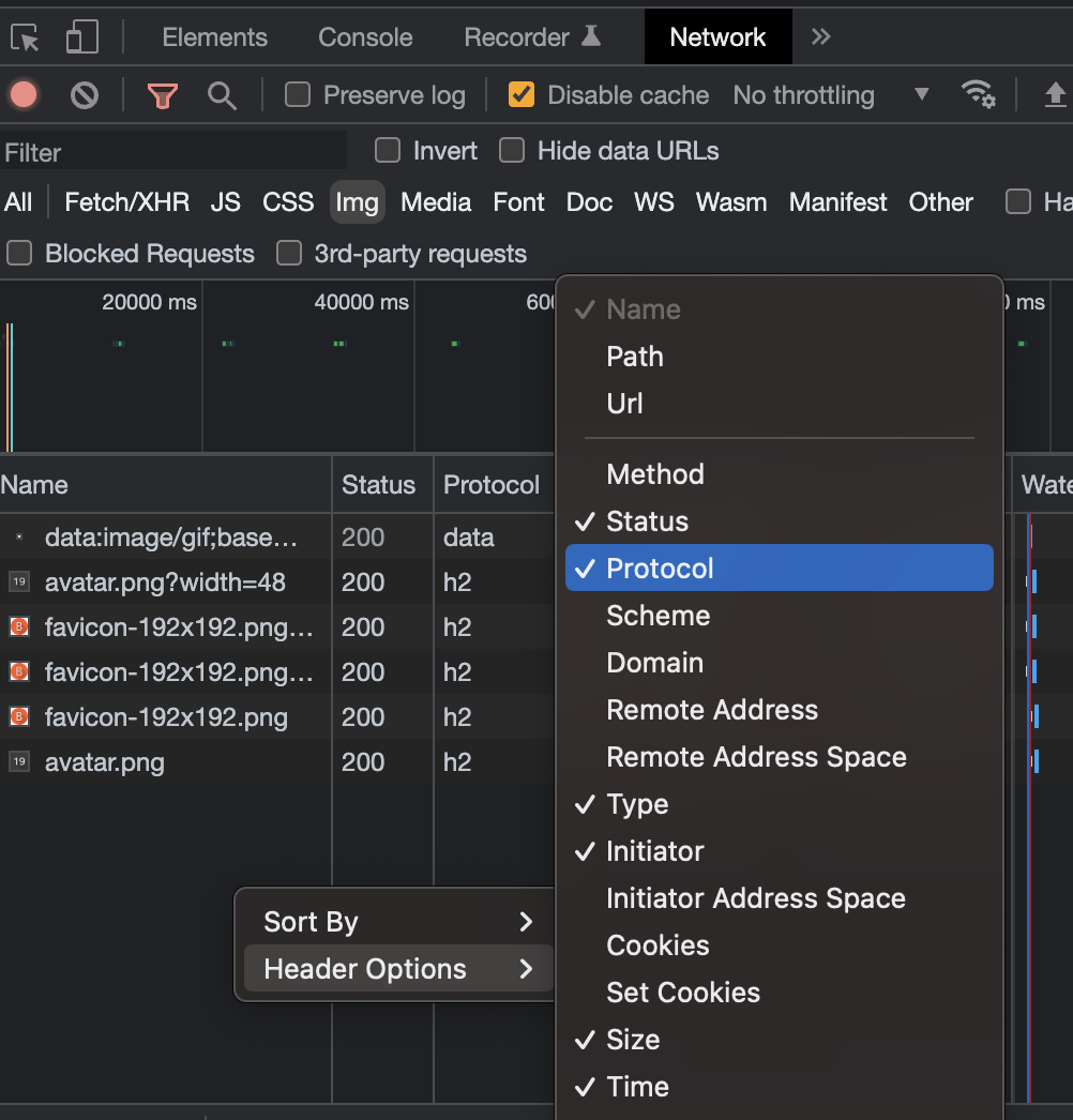 브라우저 개발자도구에서 Network > 하단 요청 그리드 영역 오른쪽 클릭 > Header Option > Protocol 클릭 후 확인